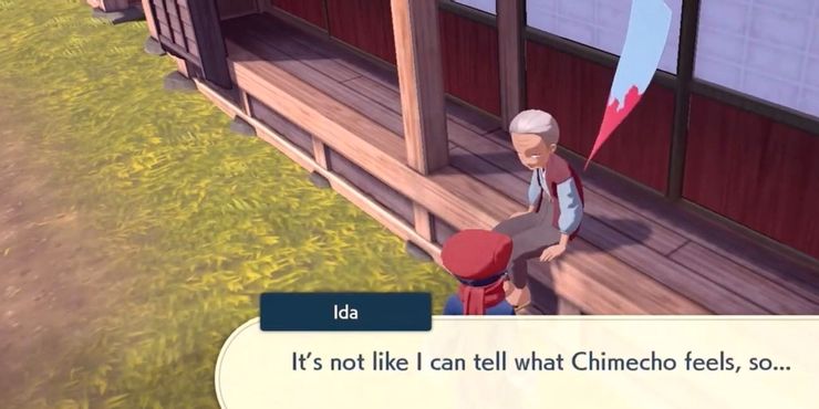 Mucha gente todavía teme a Pokémon en Leyendas: Arceus’ período de tiempo, lo que explica las actitudes de Ida, quien da la misión. La anciana le pide a la protagonista que la ayude a mover un Chimecho que ha hecho su hogar en el alero sobre su puerta. El Chimecho es un Pokémon parecido a un carillón de viento, nada especial en la batalla más allá de su tendencia a sonar fuerte, alertando a otros Pokémon salvajes en el área y haciéndolos más difíciles de atrapar. Este Chimecho tiene una sonrisa feliz y emite su repique por encima de Ida mientras sopla la brisa. Ida dice que anidó en su casa sin que ella se diera cuenta y, “Parece lo suficientemente suave, pero no me siento cómodo con tener un Pokémon tan cerca..” Esto es comprensible para cualquier residente de la aldea de Jubilife, ya que hay recuerdos frescos de Pokémon que acabaron con los asentamientos en el pasado, y las extrañas distorsiones del espacio/tiempo están causando que los Pokémon nobles de la región entren en un estado frenético.