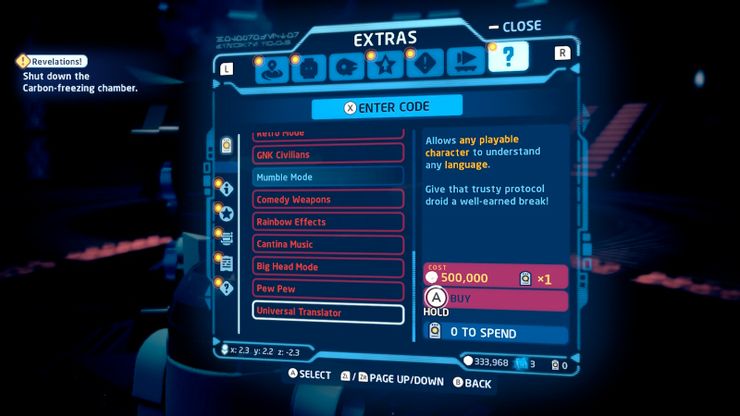 Para desbloquear el traductor universal en LEGO Star Wars: La saga Skywalker, los jugadores deberán comprarlo en la pestaña Extras del menú Holoprojector. Este modificador se encuentra al final de la lista de Datacards y los jugadores necesitarán 500 000 Studs y una Datacard para desbloquearlo. Si bien los Studs se pueden obtener haciendo casi cualquier cosa en el juego, las Datacards pueden ser más difíciles de obtener y requieren un poco más de esfuerzo para encontrarlas.