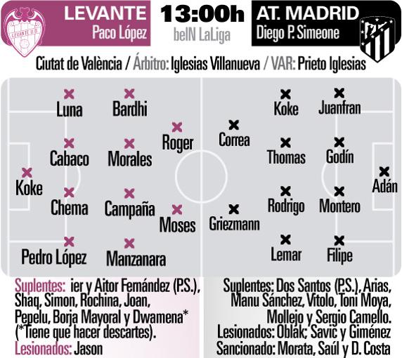 En lo deportivo, el adiós del Atlético será acorde a la losa de toda la temporada. Con una última lesión leve, la de Jan Oblak, que no estará en el césped pero será ya de forma oficial el Zamora de LaLiga. Morata, Costa y Saúl Ñíguez, por sanción; Jan Oblak, Stefan Savic, José María Giménez, Nikola Kalinic y Lucas Hernández, por lesión; y Nehuén Pérez, convocado por la selección argentina Sub-20 son las otras bajas. La lista del equipo se tuvo que completar con seis canteranos. El once previsto es el formado por Adán; Juanfran, Godín, Montero, Filipe; Koke,Thomas, Rodrigo, Lemar; Correa y Griezmann .