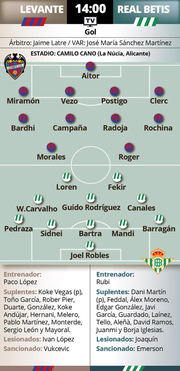 Tanto Paco López como Alexis Trujillo tienen un lesionado y un sancionado de cara a este partido. Iván López y Vukcevic en las filas locales y Joaquín y Emerson en las visitantes. El resto están a disposición de sus entrenadores, que harán algunos cambios en sus onces iniciales.