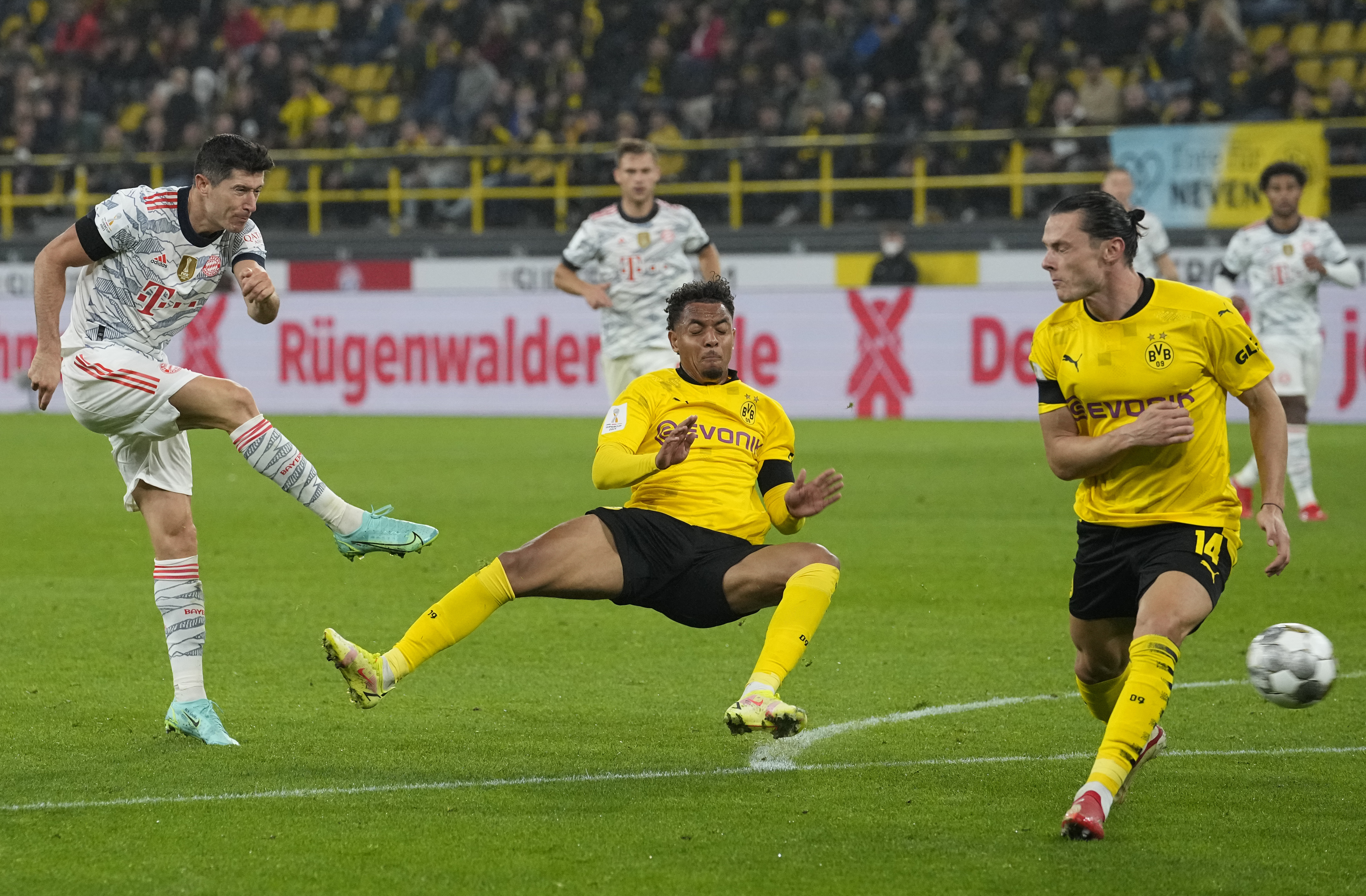 Al Bayern estaba muy incómodo en el centro del campo, incapaz de activar su rodillo característico con el que aplasta a sus rivales, pero también gozaba de las mejores ocasiones gracias a los despistes de los defensores amarillos. Esa danza en el filo duró 40 minutos para el Dortmund. Gnabry encontró una pasarela a la espalda de Passlack y, después de dejar al carrilero con un recorte, puso el balón a la frontal del área pequeña. Lewandowski, que se había quedado unos metros atrás para pasar desapercibido, entró como un cohete y martilleo el balón con un potente cabezazo.