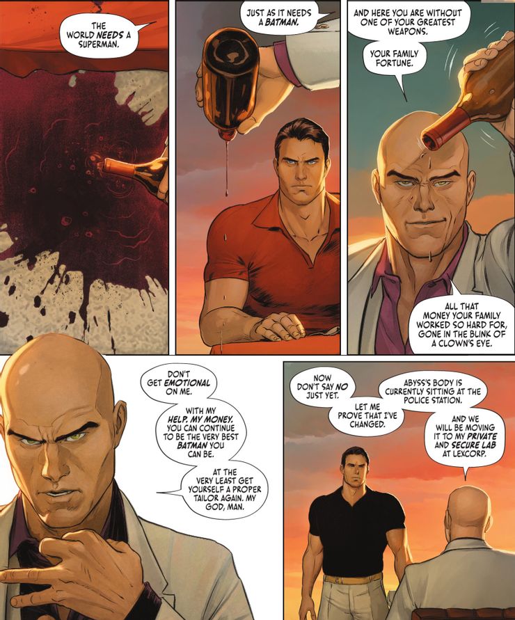 Si bien Batman es obviamente lo suficientemente inteligente como para no confiar en Luthor, sin importar cuánto diga haber cambiado, la oferta es ciertamente convincente. Dicho esto, gran parte del razonamiento de Tynion detrás de la eliminación de la obscena fortuna de Bruce fue revertir al Caballero Oscuro a un justiciero más básico donde tendría que depender más de los miembros de su familia (en lugar del dispositivo súper avanzado y costoso de la semana). ). Como tal, sería extraño para Williamson deshacer ese desarrollo del personaje haciendo que Bruce recupere su dinero gracias a Lex. Aun así, quizás Luthor pueda convertirse en un aliado cauteloso de Batman mientras investiga por qué Batman Inc. asesinó al misterioso villano conocido como Abyss.