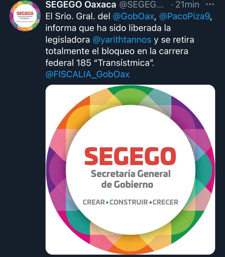 Después de cuatro días retenida por pobladores de San Juan Mazatlán Mixe y permanecer en el bloqueo carretero sobre la vía federal transísmica a la altura del poblado de Boca del Monte, Oaxaca, fue liberada la diputada local por el PRI en Oaxaca, Yarith Tannos Cruz.