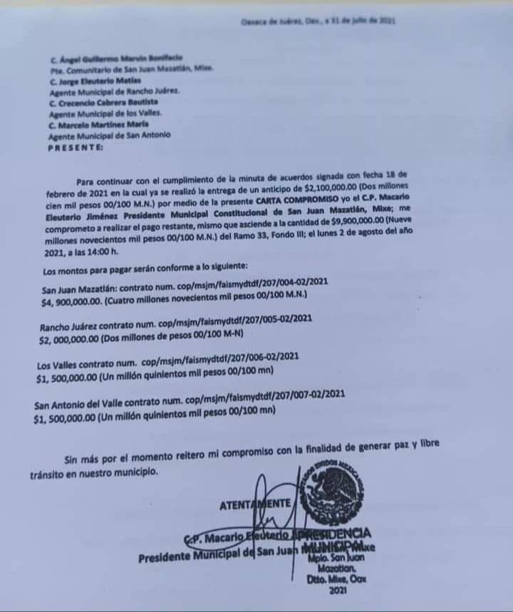 En un documento fechado del día 31 de julio, el presidente municipal Macario Eleuterio Jiménez se comprometió a otorgar los casi 10 millones de pesos este lunes.