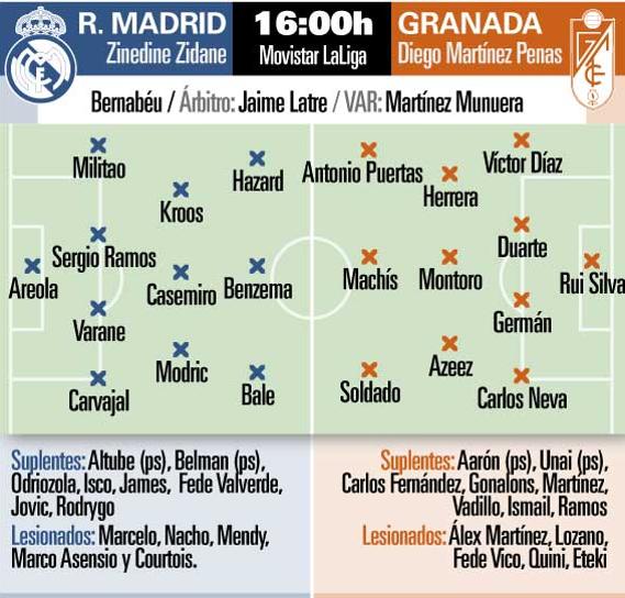 Zidane quiere recuperar ese espíritu liguero ante el Granada y alejarse lo máximo posible de la mala primera mitad frente al Brujas. Y lo tendrá que hacer sin el portero titular y sin lateral izquierdo. Courtois, señalado por la grada en el 2-2 de Champions, sigue con un virus estomacal que le impidió jugar la segunda mitad ante el Brujas y que le ha mantenido en el dique seco estos días. Una ausencia que le evitará al belga los pitidos hoy de la grada. Areola, que se ha ganado el cariño del Bernabéu, sera el sustituto de Courtois bajo palos. Aunque el gran problema para Zidane ante el Granada no es la portería, si no el lateral izquierdo. Mendy y Nacho están lesionados y ayer ‘cayó’ Marcelo que sufre una “elongación en el bíceps femoral de la pierna derecha”, según el parte médico del Madrid. Militao parte con todos los números para ser el lateral zurdo en un once al que regresará Bale y en el que Zidane podría dar descanso a Casemiro o Kroos y hacer jugar a James, que como Bale no jugó ante el Brujas.