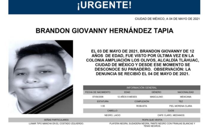 La Fiscalía de Investigación y Persecución de los Delitos en Materia de Desaparición Forzada de Personas y la Desaparición Cometida por Particulares y Búsqueda de Personas desaparecidas intervino y emitió volantes con la fotografía de Brandon Giovanny Hernández Tapia, de 12 años de edad.