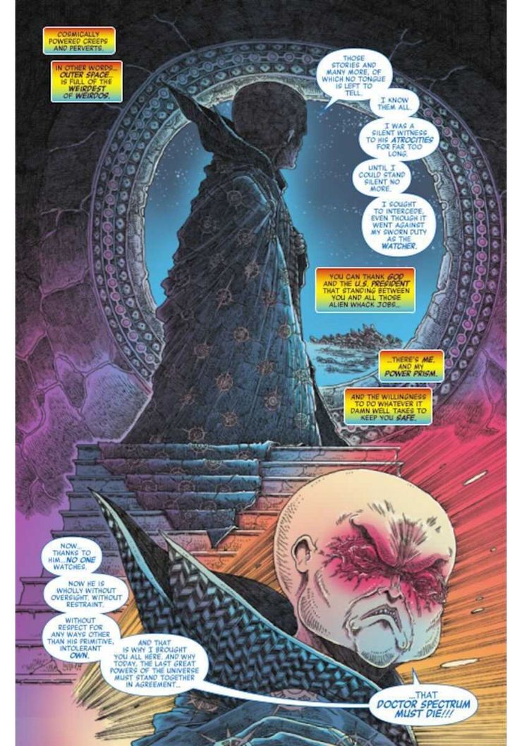 Ser una de las personas más buscadas de la galaxia no impide que el Doctor Spectrum promulgue la ley y el orden en toda la galaxia. Ha visto pelear contra Thanos y usar su Power Prism (y una pistola masiva) para cortar los Infinity Rings del Mad Titan directamente de su mano cortándole los dedos.
