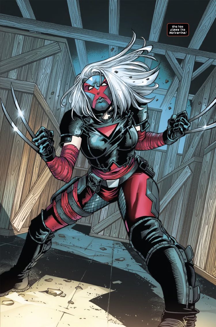 Bellona, un clon del clon de Wolverine, Laura Kinney, también conocida como X-23, carece de un factor de curación, pero, como señala Elektra en su pelea en Temerario #2 – ella no siente dolor. Bellona nunca manifestó su propia mutación a pesar de ser un clon mutante; sin embargo, fue entrenada desde “nacimiento” para ser una de las mujeres más mortíferas del planeta. Es comprensible por qué Bellona está confundida sobre por qué Madame Masque la contrató: esto es una “guerra de pandillas” y ella es un Wolverine. Convocar a alguien como ella a una guerra callejera parece una exageración.