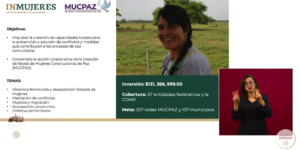En tanto, el Instituto Nacional de las Mujeres (INMUJERES), en corresponsabilidad operativa y financiera con la SSPC, diseñó e implementa el programa Mujeres Constructoras de Paz (MUCPAZ) que tiene como objetivo conformar grupos de trabajo, planeación y participación de las mujeres para que estas sean reconocidas como multiplicadoras del proceso de paz a nivel territorial.
