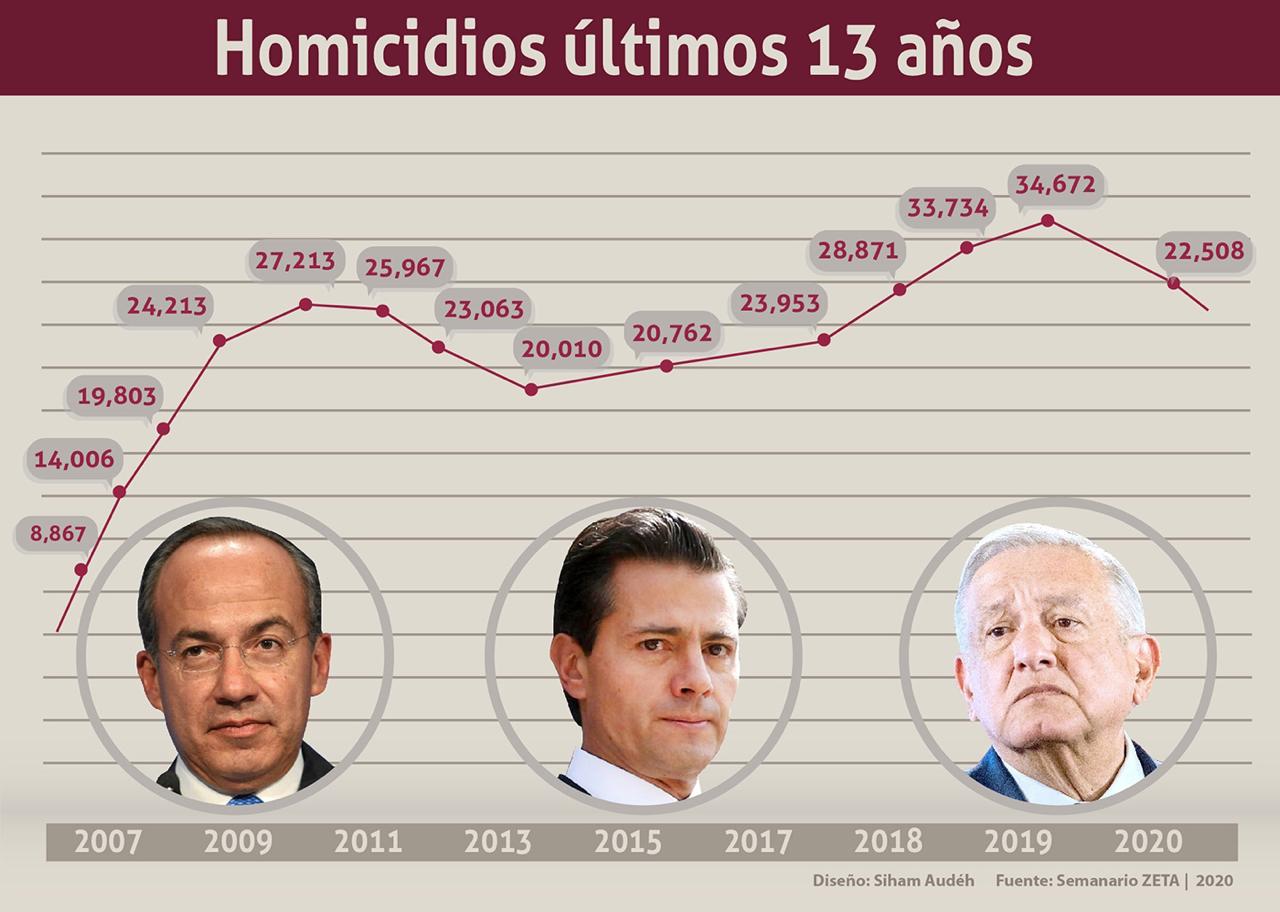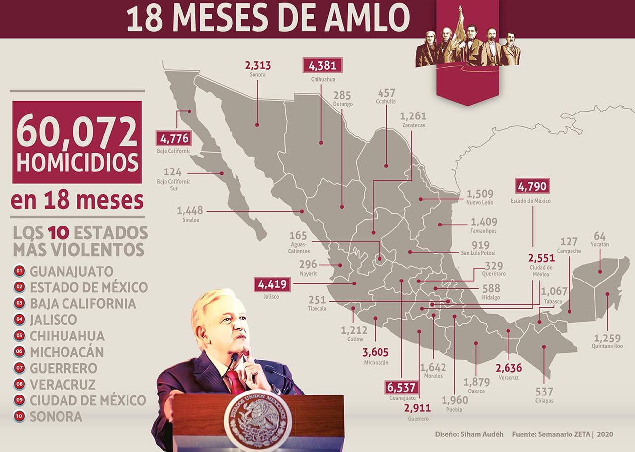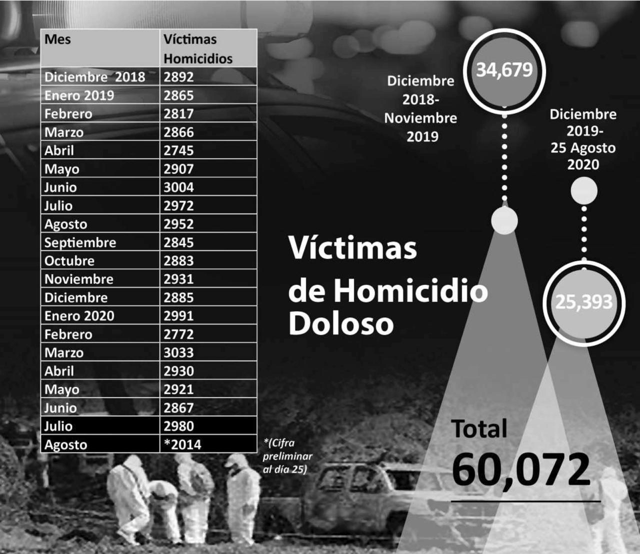 De acuerdo a cifras preliminares del Secretariado Ejecutivo del Sistema Nacional de Seguridad Pública (SESNSP), hasta el día 25, el mes de agosto acumulaba dos mil 14 homicidios, que sumados a los 58 mil 058 muertos contabilizados en los 18 meses previos, dan un total de 60 mil 72 muertes violentas en lo que va del sexenio de AMLO. Un número incluso mayor a las 41 mil 13 muertes de los dos primeros años de su antecesor Enrique Peña Nieto.