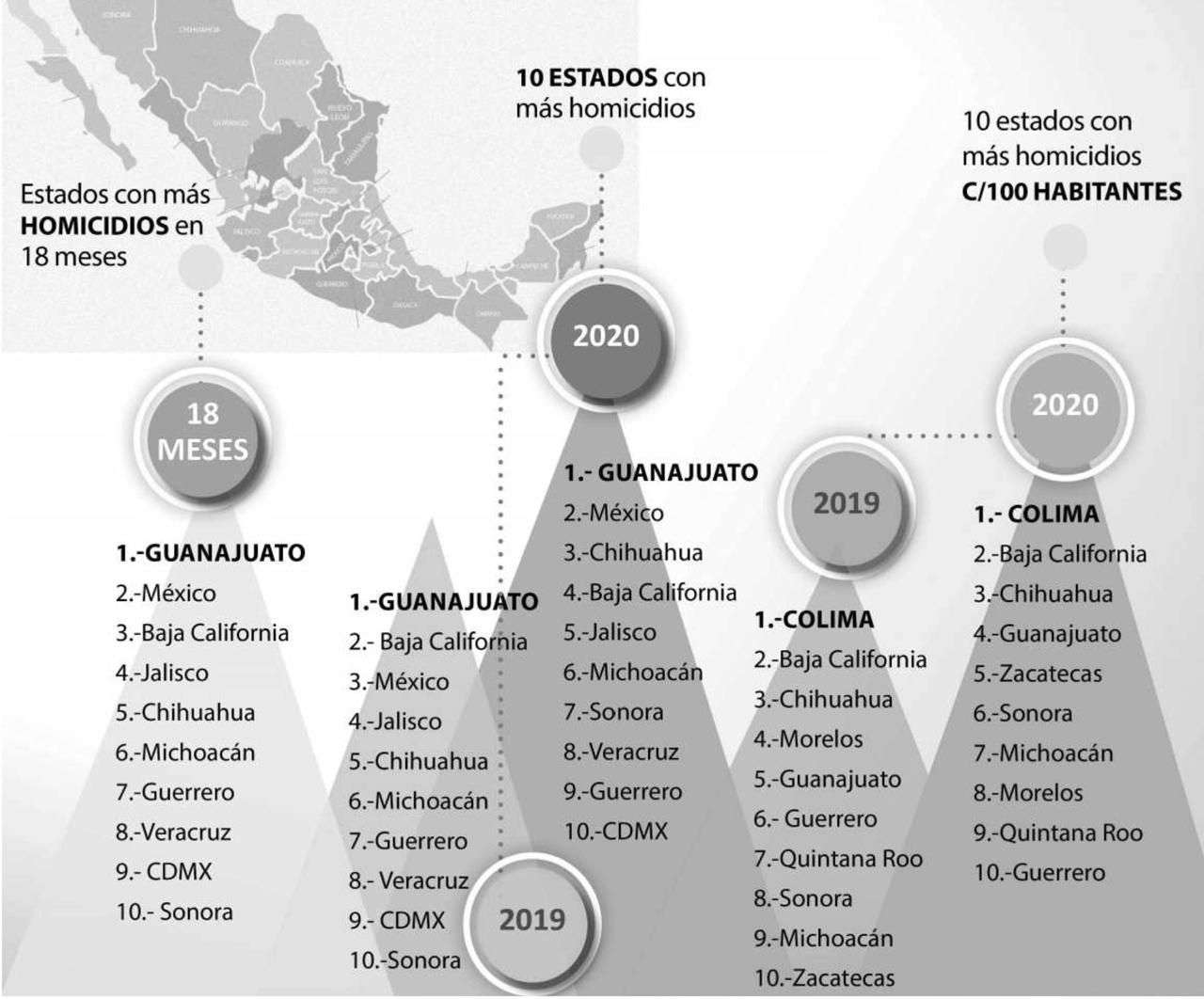 En cuanto a los estados más sangrientos por cada 100 mil habitantes, al igual que el año pasado: Colima, Baja California, y Chihuahua, conservaron su primer, segundo y tercer lugar; Guanajuato pasó del quinto al cuarto lugar; y Zacatecas, Sonora, Michoacán, Morelos, Quintana Roo, y Guerrero se mantuvieron en la lista, en diferente posición.