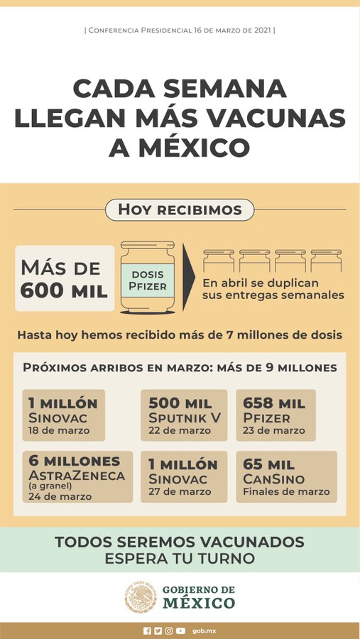 Hasta el 16 de marzo nuestro país había adquirido un total de 7 millones 160 mil 250 vacunas contra SARS-CoV-2, por lo que con esta adquisición la cifra supera los 8 millones: