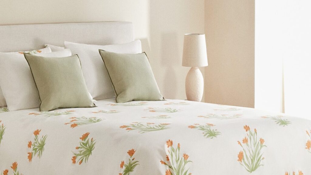 Serán fan de esta ropa de cama con descuento de Zara Home cuando la veas en directo. La elegancia personificada llega a nuestro dormitorio, unos colores que aportan luz, naturales y enérgicos son la carta de presentación de esta funda de nórdico que va a juego con cojines. Una apuesta segura con un descuento del 30%. Si tienes una habitación pequeña busca este tipo de tonalidades son perfectas para darle luz con ese toque primaveral y fresco de las flores.