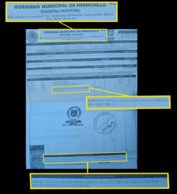 En esta hoja sin membrete oficial, se escribieron a mano los números de serie de maquinaria por la cual no se realizó ningún pago ante el ayuntamiento de Hermosillo. Además, el documento aparece con un sello oficial.