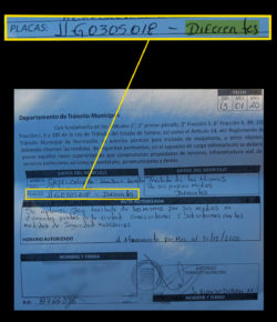 Al permiso oficial, firmado por el director de tránsito, se anexa un tercer documento fuera del procedimiento normal, que lleva un sello de la Policía Municipal: se trata de una hoja que incluye -además de las placas del vehículo por el que se hizo el pago- otras más que no fueron autorizadas mediante una transacción en Tesorería.
