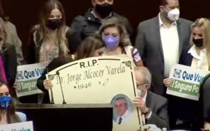 Mientas tanto, diputados panistas cargaron en la tribuna carteles con la leyenda: “que vuelva el seguro social“.