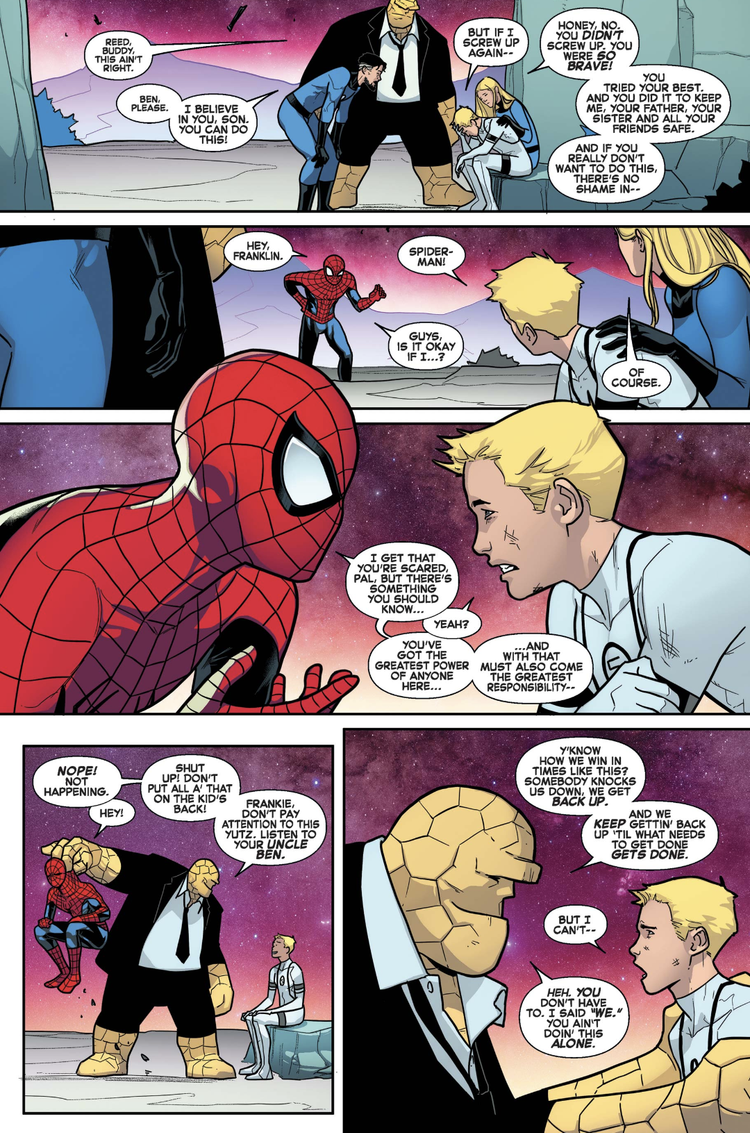 En lugar de reforzar la idea de que Franklin tiene una gran responsabilidad sobre sus hombros, Ben Grimm le recuerda a su sobrino que hay una posibilidad mucho más grande de derrotar al dolor de lo que piensa, y que todos los que ama estarán allí para que suceda. Si bien el consejo de Spider-Man proviene de un lugar generoso, no es exactamente el tipo de lección que Franklin quiere o necesita aprender en este momento. Las circunstancias son totalmente diferentes, después de todo. El consejo del tío Ben, junto con su muerte, le enseñó a Peter Parker a ser menos engreído, mientras que Franklin Richards lucha con la confianza en sí mismo cuando se enfrenta al dolor de Cuatro fantásticos #3.
