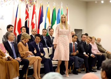 Con gobernantes o con empresarios, en Japón o en Seúl, han quedado múltiples imágenes de su paso por la cita. Pero si solo una pasase a la posteridad, sería la de un vídeo que difundió el Gobierno francés. En él, la hija de Trump aparece tratando de meter baza en un círculo con Theresa May, Emmanuel Macron, la directora gerente del FMI, Christine Lagarde, y el primer ministro canadiense, Justin Trudeau. Macron hace alguna reflexión sobre justicia social a la que May responde sobre la incorporación del factor económico. Ivanka interviene entonces con un comentario sobre la industria controlada por varones, que no obtiene réplica de nadie, y Macron vuelve a dirigirse a May. Lagarde, mientras la hija de Trump habla, sacude la cabeza y pestañea varias veces en silencio.