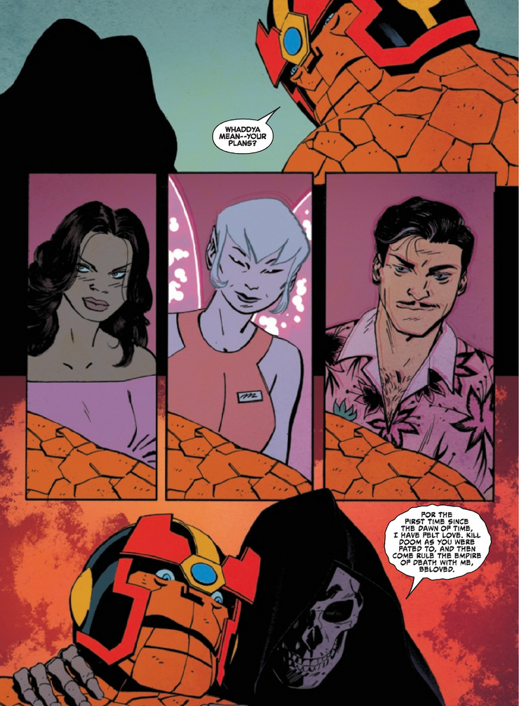 Estas son malas noticias para Ben, ya que ahora ha sido arrastrado involuntariamente al paisaje cósmico de Marvel, donde las vidas de planetas enteros pueden estar en juego. Todavía no está claro si los sentimientos profesados de Death son ciertos, o si solo ha estado manipulando The Thing para detener el plan de Doom de apoderarse de su reino. La vida amorosa de Ben siempre ha sido atormentada ya que nunca pudo hacer las paces con su aspecto monstruoso, pero el amor de Mistress Death, un ser que incluso Galactus caerá presa algún día, es probable que sea demasiado para el Cuatro Fantásticos‘s Cosa manejar.