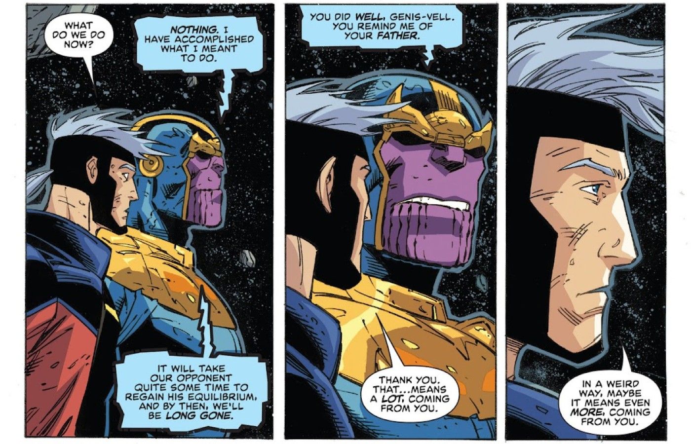 - Thanos elogia el poder bruto de Genis-Vell y lo compara con su padre, solidificando su rango en los niveles de Marvel Comics.