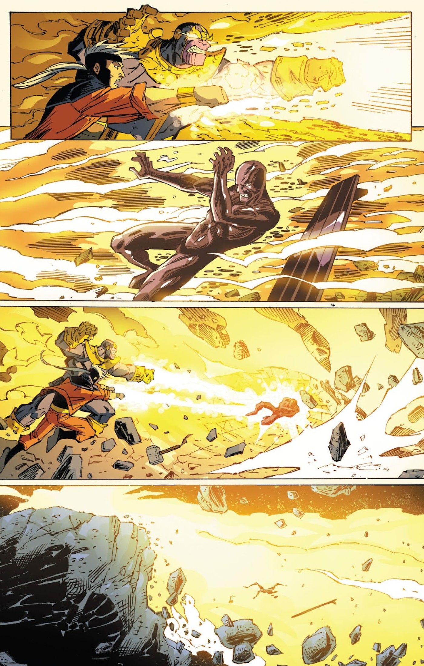 “/> The Black Surfer resurge, tras debutar por primera vez durante el Thanos gana Arco como una versión futura de Silver Surfer que ha sido corrompida por Black Matter. Silver Surfer y Thanos se unen a regañadientes para enfrentarlo. Cuando el Surfer actual desaparece en un intento de salvar la vida de Genis-Vell, el ex Capitán Marvel esencialmente entra en acción, sacando el martillo de Thor de la mano de Black Surfer. Genis-Vell lucha por levantar a Mjölnir por sí mismo, pero Thanos le asegura que no será necesario porque esta pelea se trata de “Fuerza Bruta.” Con su poder bruto combinado, Thanos y Genis-Vell logran borrar al Caído de la luna.