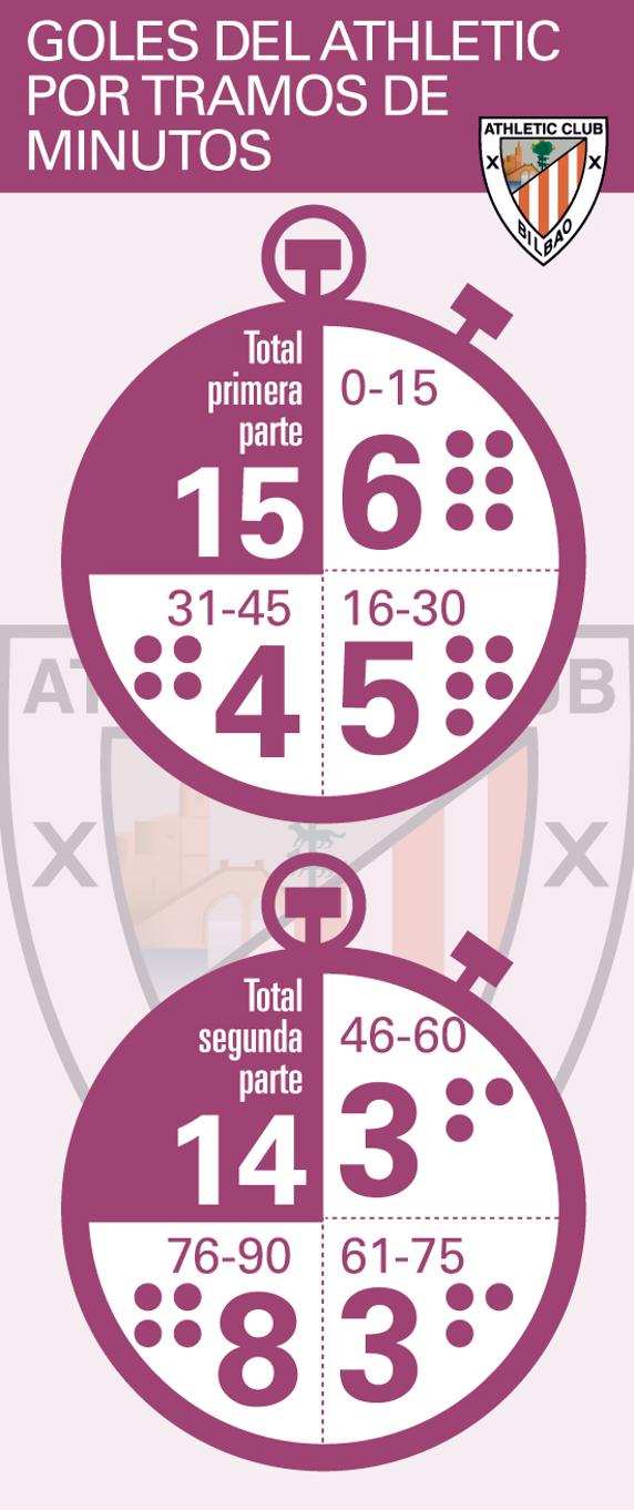 ¿Cómo se distribuyen las dianas del Athletic? Introduzcamos el bisturí apoyándonos en las manecillas del reloj. La primera conclusión es que existe un equilibrio casi total entre las primeras y las segundas partes de los encuentros. 15 muescas antes del descanso y 14 a partir de la reanudación. Pero yendo más al detalle se puede deducir que el conjunto rojiblanco es de principios y de finales.
