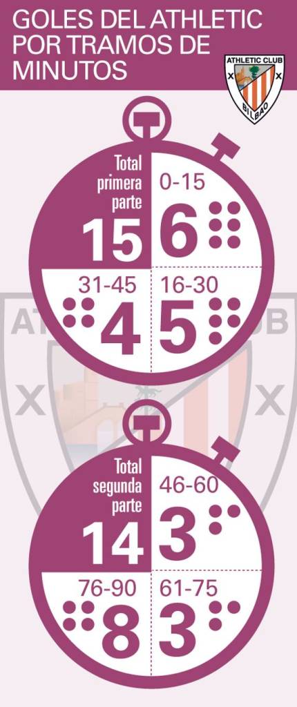 ¿Cómo se distribuyen las dianas del Athletic? Introduzcamos el bisturí apoyándonos en las manecillas del reloj. La primera conclusión es que existe un equilibrio casi total entre las primeras y las segundas partes de los encuentros. 15 muescas antes del descanso y 14 a partir de la reanudación. Pero yendo más al detalle se puede deducir que el conjunto rojiblanco es de principios y de finales.