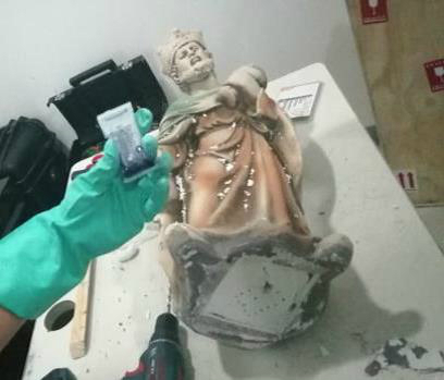 El aseguramiento se dio en el Aeropuerto Internacional de la Ciudad de México (AICM) donde hallaron dos cajas de madera que en su interior contenían una figura religiosa con un peso bruto aproximado, en la primera, de 31 kilogramos; y en la segunda, de 18 kilogramos, ambas hechas de metanfetamina.