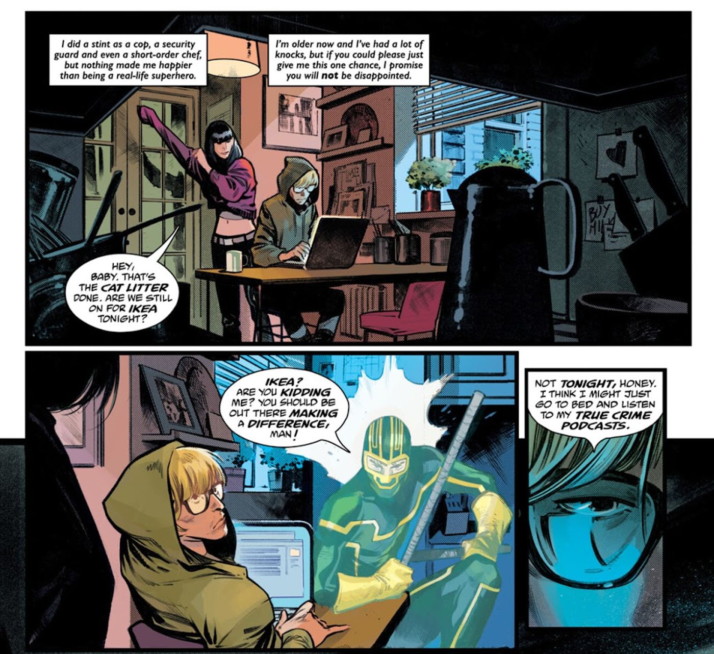 En Gran juego # 1, Dave Lizewski afirma que él “hizo una temporada como policía, guardia de seguridad e incluso como chef de comida rápida” mientras aún vive con su novia Valerie a lo largo de los años. Parece una vida ideal para la mayoría de las personas, pero no para Dave. Mientras aparentemente vive una vida cómoda, lejos del peligro, se representa a Dave anhelando convertirse en Kick-Ass una vez más y salvar vidas inocentes. De hecho, se siente culpable por no volver al papel antes. Cuando Valerie sugiere un viaje a IKEA para salir por la noche, el personaje Kick-Ass de Dave lo regaña diciendo: “¿IKEA? ¿Me estás tomando el pelo? ¡Deberías estar ahí afuera haciendo la diferencia, hombre!