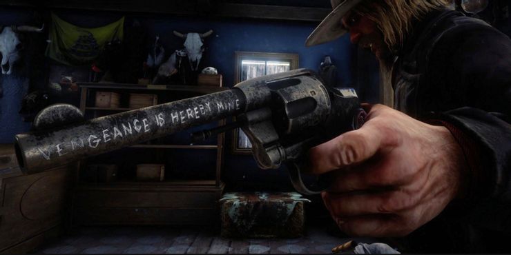 Aunque los revólveres de doble acción de Micah tienen mangos negros con adornos de calaveras de color rojo brillante, el aspecto más notable de las armas es la frase “LA VENGANZA ES MIA“grabado en uno de los barriles. Esta arma en realidad puede ser adquirida por los jugadores si regresan a donde matan a Micah en Mount Hagen cerca del final de redención muerta roja 2. Las armas de Micah, que son un reflejo de su personalidad, se resumen mejor en una de las citas más famosas de Arthur: “La venganza es un juego de idiotas..”