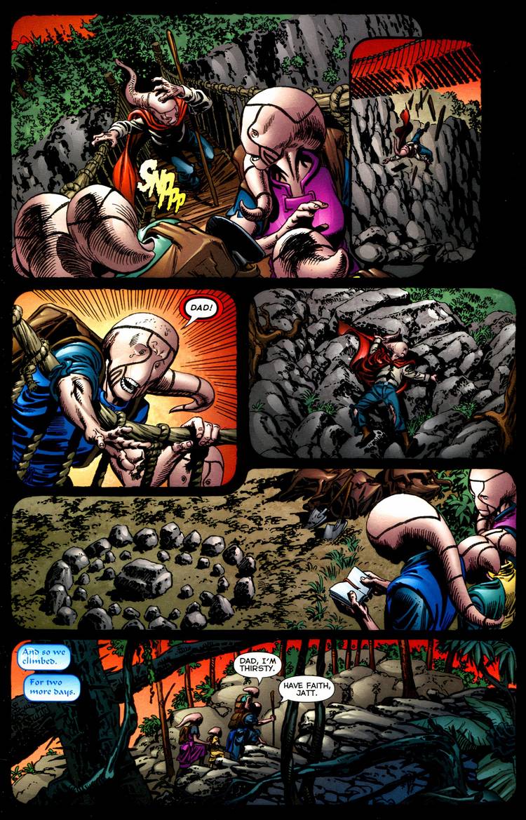 A medida que Bro’Dee escalaba la montaña, cosas cada vez más horribles comenzaron a sucederle a él y a su familia. Uno por uno, sus familiares no sobrevivieron al viaje. Bro’Dee creía que todo esto era sólo una prueba de Dios.y continuó asegurándole a su familia que todo estaría bien, pero cada vez se hacía más difícil seguir adelante. Su padre cayó y murió en un cañón; su esposa y su hija se ahogaron en un río; y su hijo murió tras comer frutos venenosos. A pesar de ver morir a toda su familia en el viaje que él los llevó, la fe de Bro’Dee no podía ser quebrantada. Finalmente llegó a la cima de la montaña, sólo para descubrir: nada.