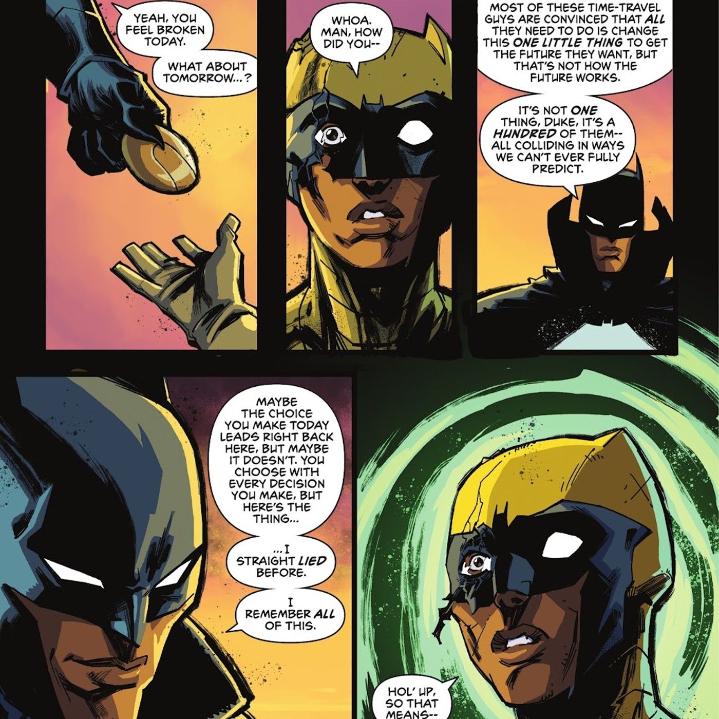 Los dos Robins, también conocidos como los hermanos Rook, intentan luchar contra Duke, pero son cancelados por un Batman emergente, que rápidamente se revela como la versión adulta de Duke Thomas. Después de que los dos se abrazan, Signal ayuda a los héroes del futuro a detener un dron de exploración, un monstruo diseñado para devorar anomalías del tiempo (como un joven que se encuentra consigo mismo en el futuro). Antes de enviarlo de regreso al presente, Batman le da al joven Duke una charla de ánimo para darle la confianza que necesita para ser la mejor señal posible.