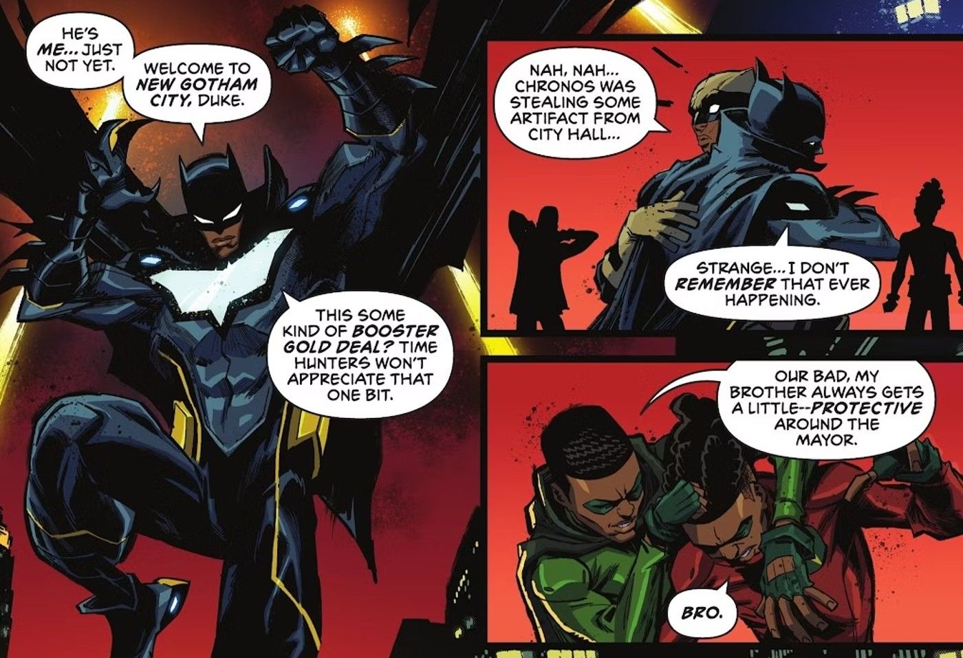 “/> La historia comienza con Signal formando equipo con Batgirl de Stephanie Brown y Bluebird de Harper Row para enfrentarse a Chronos. A medida que Duke es pulverizado por la oposición, se frustra consigo mismo por cada error que comete, y tal vez eso nuble su juicio, lo que lleva a lo que sucederá a continuación. A pesar de haber sido advertido sobre el desplazador del tiempo de Chronos, Duke fuerza el contacto con él, lanzándolo al futuro. Se despierta en New Gotham City y ve a la alcaldesa Renee Montoya en una azotea con múltiples Bat-Señales mientras dos nuevos Robins se estrellan contra este misterioso extraño.