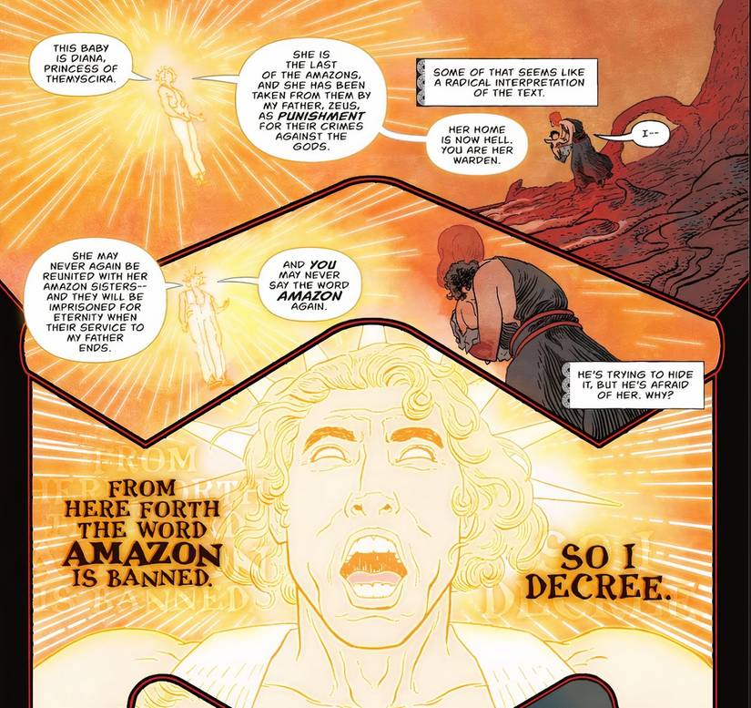 El título de Diana deja a los lectores con mucho que desentrañar, y sirve como un poderoso resumen de su origen en el Universo Absoluto. Además de la intensa acción de Wonder Woman arrasando con los engendros del infierno, el número utiliza flashbacks para contar su historia desde el principio. Comienza con el dios griego Apolo entregando a la niña Diana a Circe, quien está exiliada en una isla en el infierno. Apolo presenta a Diana como la princesa de Themyscira y le explica que ella es la última de las Amazonas, arrebatada de su pueblo por Zeus como castigo por su desafío a los dioses.con Circe ahora encargada de actuar como ella “guardián.”