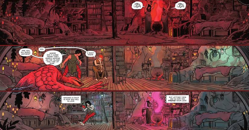 Decir que Circe estaba disgustada por tener que cargar con un bebé en el infierno es quedarse corto. Inicialmente, la bruja tenía la intención de dejar que las criaturas de la isla mataran al bebé, ya que no se le había asignado explícitamente la tarea de mantener viva a Diana. Sin embargo, cuando la bebé Diana arroja la serpiente enviada para matarla, lo que demuestra que está lejos de ser común y corriente, se despierta el interés de Circe. A partir de ese momento, la bruja comienza a criar a Diana y a enseñarle brujería, dándose cuenta de que “Cómo se enamora un niño es criándolo.” Este sentimiento está bellamente ilustrado por Sherman y Bellaire, quienes capturan la transformación de Diana de niña a niña, luego a adolescente y finalmente a adulta joven bajo el cuidado de Circe.