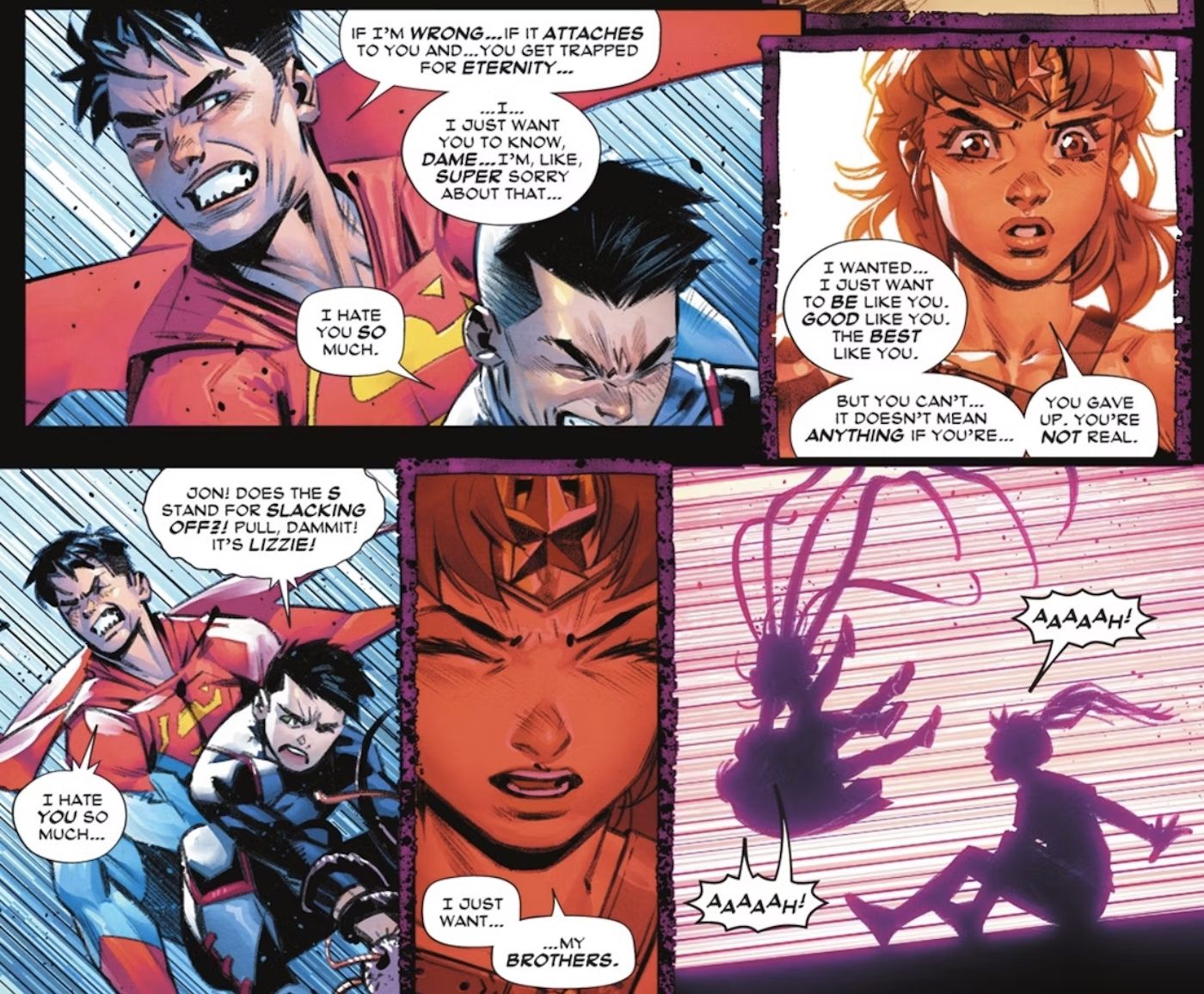 Aunque la historia original de Black Mercy es bien conocida como una película lacrimógena de DC (una famosa adaptación para la serie animada Liga de la Justicia Ilimitada), la experiencia de Trinity con el Black Mercy es decididamente más alegre y optimista. La historia de respaldo tiene un tono en gran medida cómico, mientras Jon y Damian pelean por la mejor manera de liberar a Lizzie (usar el pesimismo de Robin a su favor se convierte en su mejor solución). Mientras tanto, Trinity se deleita golpeando a Jon y Damian, a quienes considera sus hermanos mayores, lo que demuestra que se está convirtiendo en una guerrera temible igual a su madre. Al mismo tiempo, la revelación de que Lizzie realmente quiere ser como Jon y Damian es esperanzadora y conmovedora, a diferencia del sueño Black Mercy de Superman.