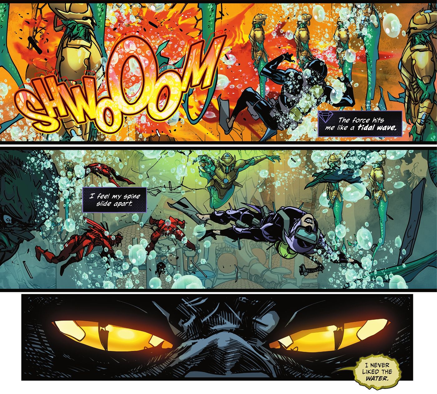 Los puntos fuertes de Catwoman no residen sólo en el robo, sino también en entrar y salir con vida de espacios reducidos. Este atraco le costó dos vidas, dejándola con sólo tres. Ella le pregunta a Bastet si debería abandonar estas misiones y pasar el resto de su vida en Gotham con Batman. La diosa descarta esta línea de pensamiento y advierte a Catwoman que el depredador ahora es una presa: los villanos a los que Selina ha agraviado se están uniendo para acabar con ella. Mientras que su excursión submarina le demostró que Aquaman es más que una broma, catwoman Necesita abandonar su curiosidad antes de que la maten.