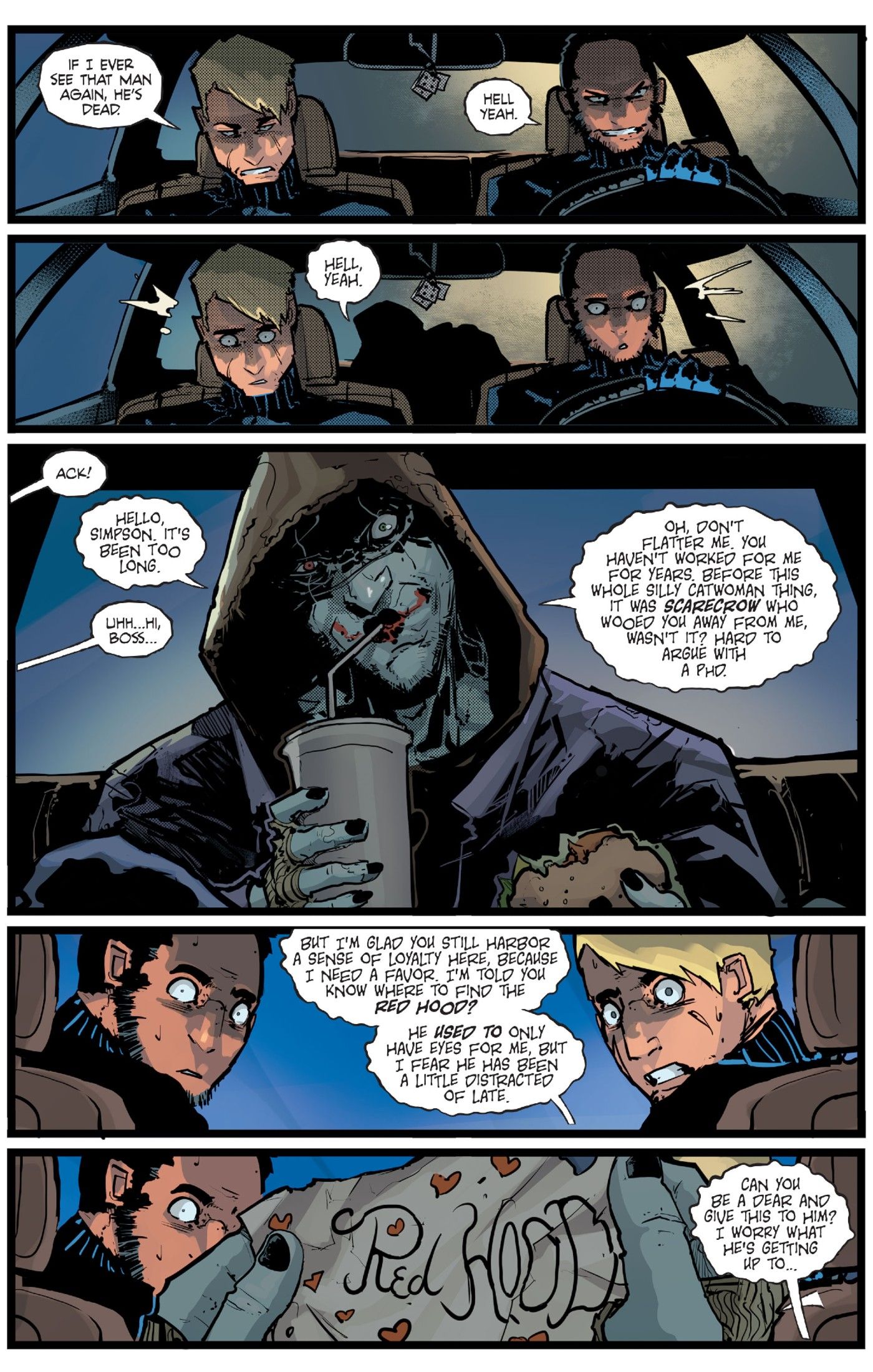 En el problema, Joker regresa a Gotham después de un tiempo recuperándose en el extranjero, solo para dirigirse directamente hacia Jason Todd, estableciendo un plan para llamar la atención de Red Hood. Recientemente, Red Hood ha tenido la misión de matar al Joker, pero la Guerra de Gotham de Batman y Catwoman le ha robado la atención. Ahora, es el Joker el que busca a Red Hood y se pone en contacto con los matones que Jason entrenó recientemente para el lado del conflicto de Catwoman.