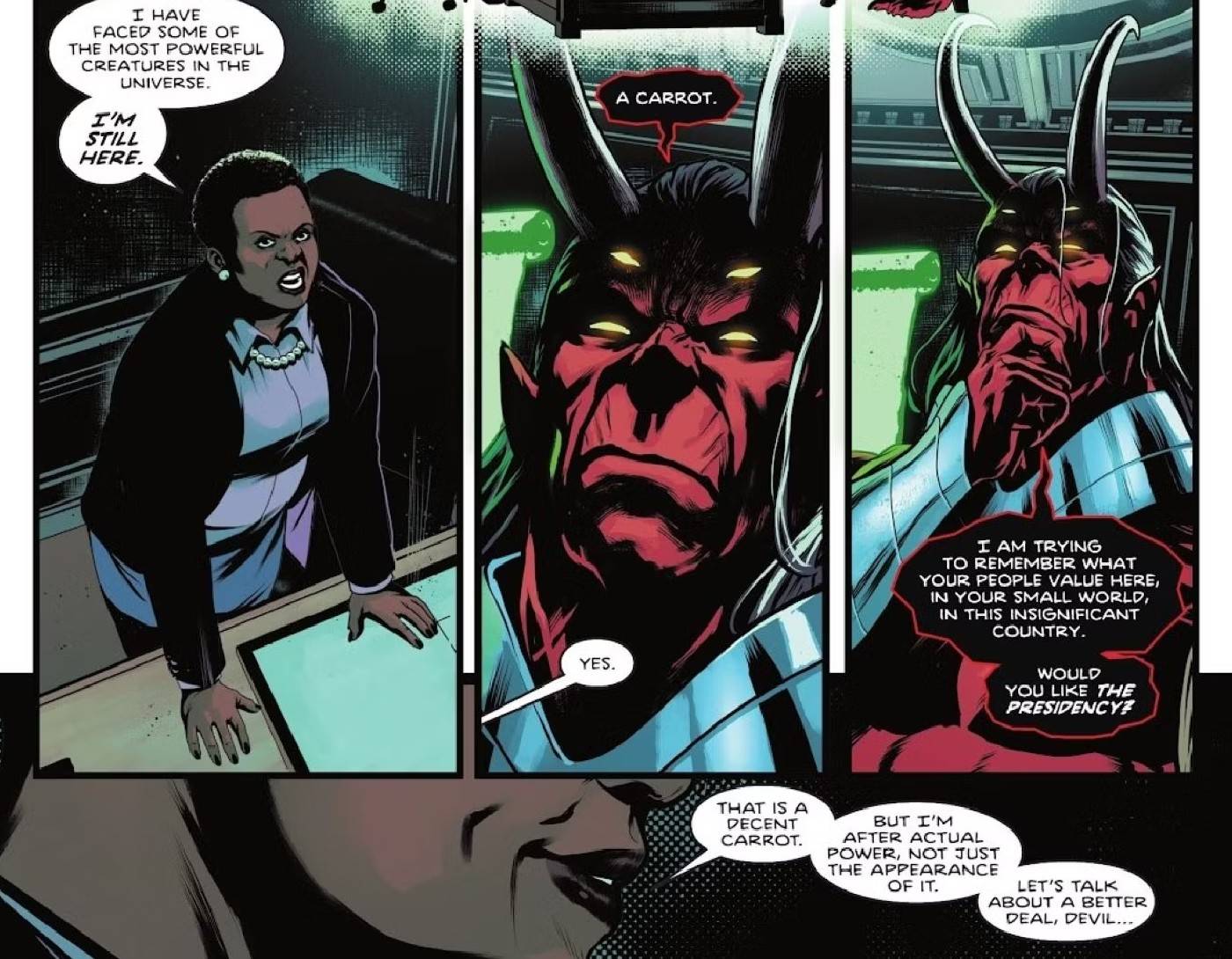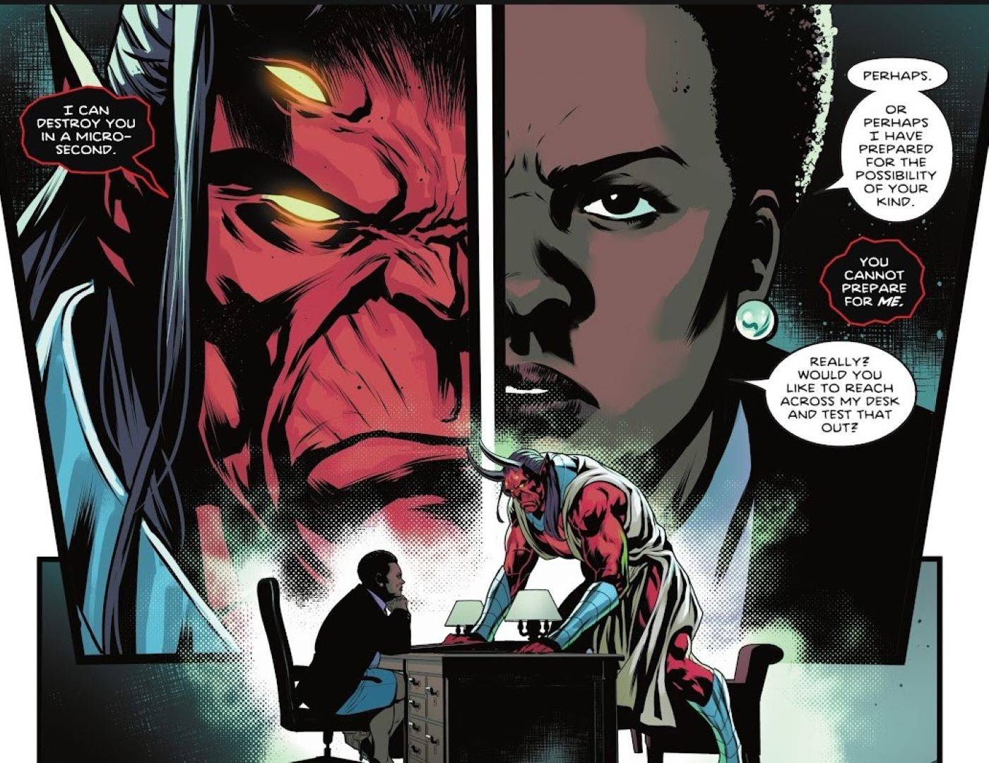 Inicialmente, Trigon duda de la afirmación de Waller, pero enfatiza que se ha enfrentado a algunos de los seres más poderosos del universo y “todavía está aquí”. Esto convence a Trigon de que es posible que Waller no esté mintiendo y que probablemente tenga un plan de contingencia para él, lo que lo llevará a aceptar términos más amigables. La disposición de Waller para lidiar con Trigon demuestra su destreza en la planificación de contingencias, rivalizando con Batman en este aspecto. El hecho de que Batman no haya mencionado un plan de contingencia para el padre de Raven, a pesar de que Nightwing se enfrenta frecuentemente a Trigon, sugiere que Waller puede poseer un plan de contingencia que ni siquiera Batman ha considerado.