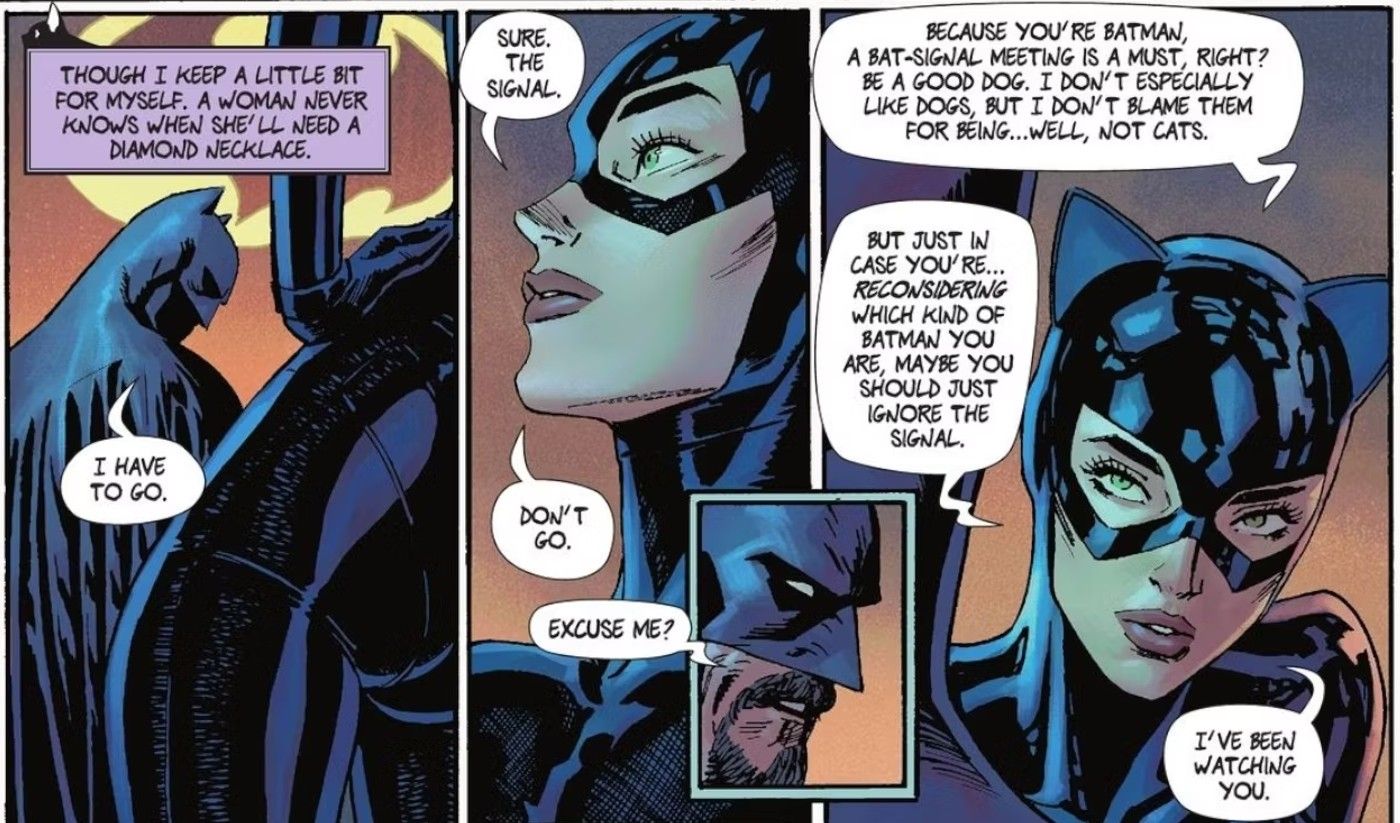 “/> Batman siempre ha tratado de prevenir el crimen lo mejor que puede, pero considerando la cantidad de amenazas que enfrenta Gotham cada noche, a menudo tiene que priorizar. En lugar de detener un atraco o un robo en los suburbios, tiene que evitar el robo a un banco de un supervillano en el centro. Si bien este método de lucha contra el crimen probablemente salva a la mayoría de las personas, aún deja a los suburbios desprotegidos. Cuando Catwoman conoce a este Batman amnésico, intenta convencerlo de que se quede donde está, ignore la Batiseñal y continúe con lo que está haciendo ahora. Incluso sostiene que la Batiseñal casi nunca se enciende para las personas pequeñas que realmente la necesitan. Si bien esto puede parecer un argumento extraño para que Catwoman lo aporte a Batman, hay una razón importante por la que está haciendo esto.