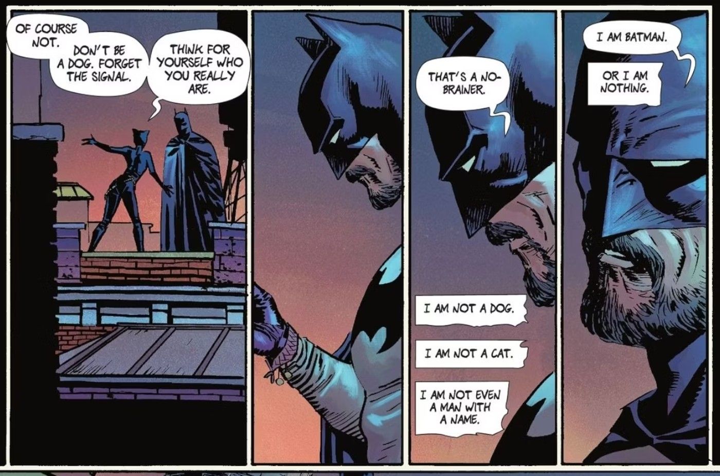 - Catwoman intenta evitar que el verdadero Batman interfiera con el trabajo del amnésico Batman, argumentando que la Batiseñal rara vez se enciende para las personas que realmente necesitan ayuda.