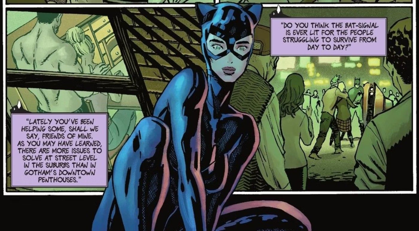 - Catwoman cree que Gotham necesita un nuevo tipo de Batman, uno que se centre en proteger los suburbios donde la gente común y corriente se ve afectada por delitos menores.