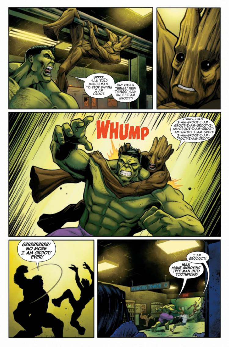 Lo único que realmente impide que Groot y Hulk nunca se unan parece ser Rocket Raccoon. Más adelante en el mismo número, Groot muestra un peluche de su amigo desaparecido, a lo que Hulk responde con una risa después de que el muñeco dice uno de los insultos de Rocket. Rocket puede ser clave para que Hulk y Groot se lleven bienya que Rocket y Groot son prácticamente inseparables. Sin embargo, con Rocket fuera de escena en esta historia, no hay nada que frene los verdaderos sentimientos de Hulk por Groot, mientras los dos chocan mientras intentan salvar la Tierra de la plaga zombie.