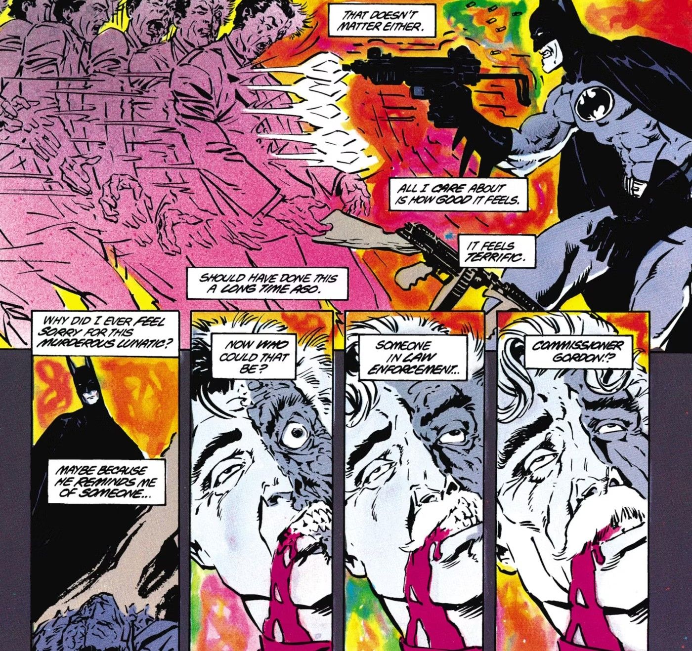El diácono Blackfire pasa días adoctrinando y drogando a Batman hasta que la mente de Bruce simplemente se rompe y se rinde a la voluntad de Blackfire. Debido a esto, Blackfire envía a Batman a lidiar con algunos mafiosos, y Batman lo hace con gusto. La parte más preocupante es que el monólogo interior de Batman describe lo bien que se siente finalmente soltarse y simplemente dispararle a la gente. Si bien es bien sabido que Batman quiere matar al Joker, los lectores casi nunca han visto al Caballero de la Noche no solo usar fuerza letal sino deleitarse absolutamente con ella.