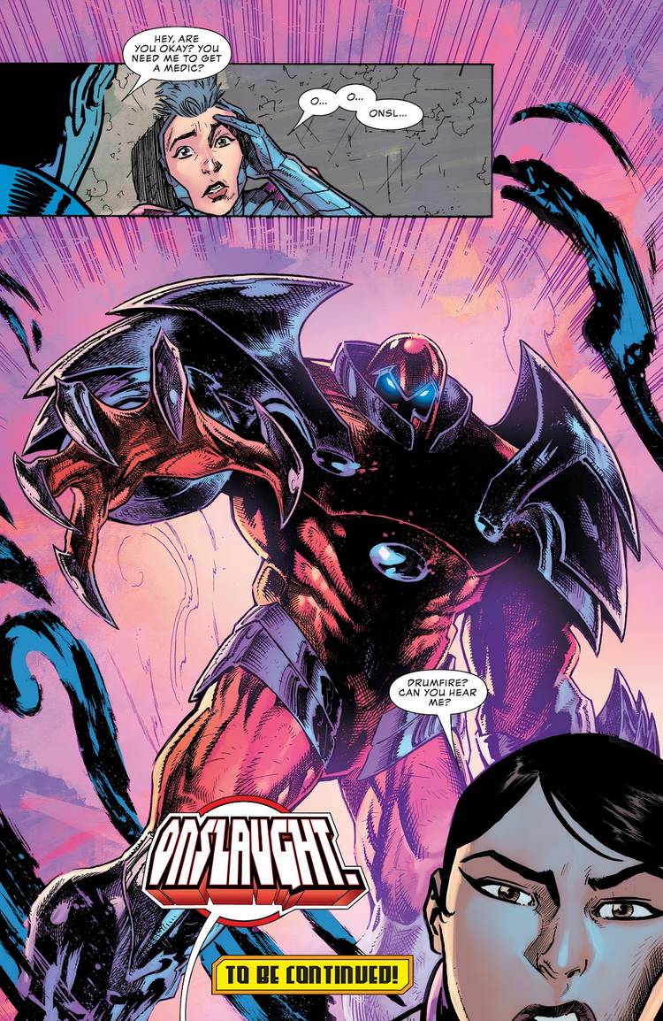 centinelas #1, del escritor Alex Paknedal con los artistas Justin Mason y Federico Blee, revela que Onslaught podría ser el primer Big Bad del equipo, después El nuevo miembro del equipo, Drumfire, es testigo de la monstruosidad después de que se activan sus poderes. por Lawrence Trask.