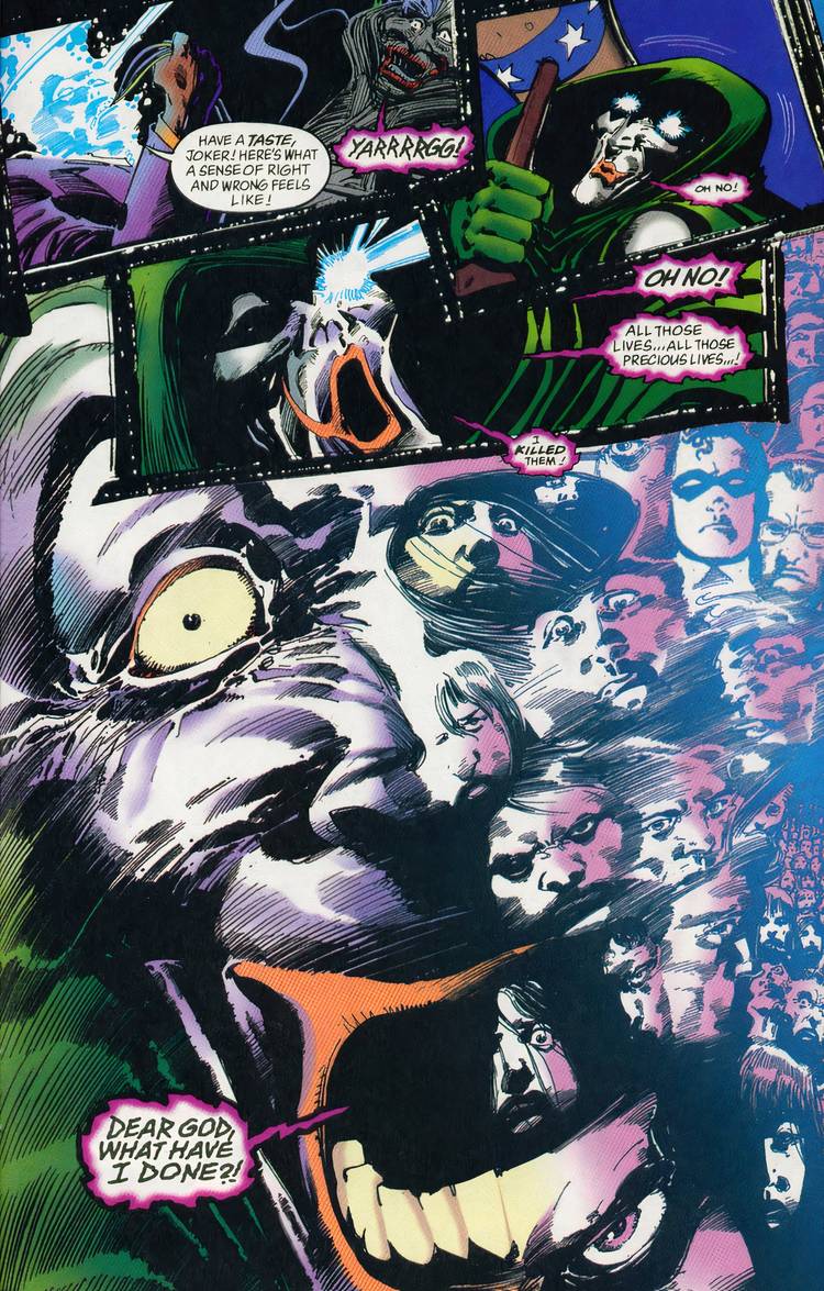 El espectro El número 51 tampoco fue la primera vez que Joker quedó cuerdo. En JLA #15, Martian Manhunter usó sus poderes para reorganizar la mente del Joker, devolviéndole la cordura. En este momento, Joker inmediatamente expresó una gran cantidad de culpa por lo que había hecho. Como explicó Spectre, el simple hecho de que Joker sea malvado es demasiado simple. Él no es malo; más bien, no puede distinguir el mal del bien. Sus acciones nacen del hecho de que no tiene sentido de la moralidad. Lo cual es significativamente más complejo y trágico que el hecho de que Joker sea una criatura de pura maldad.