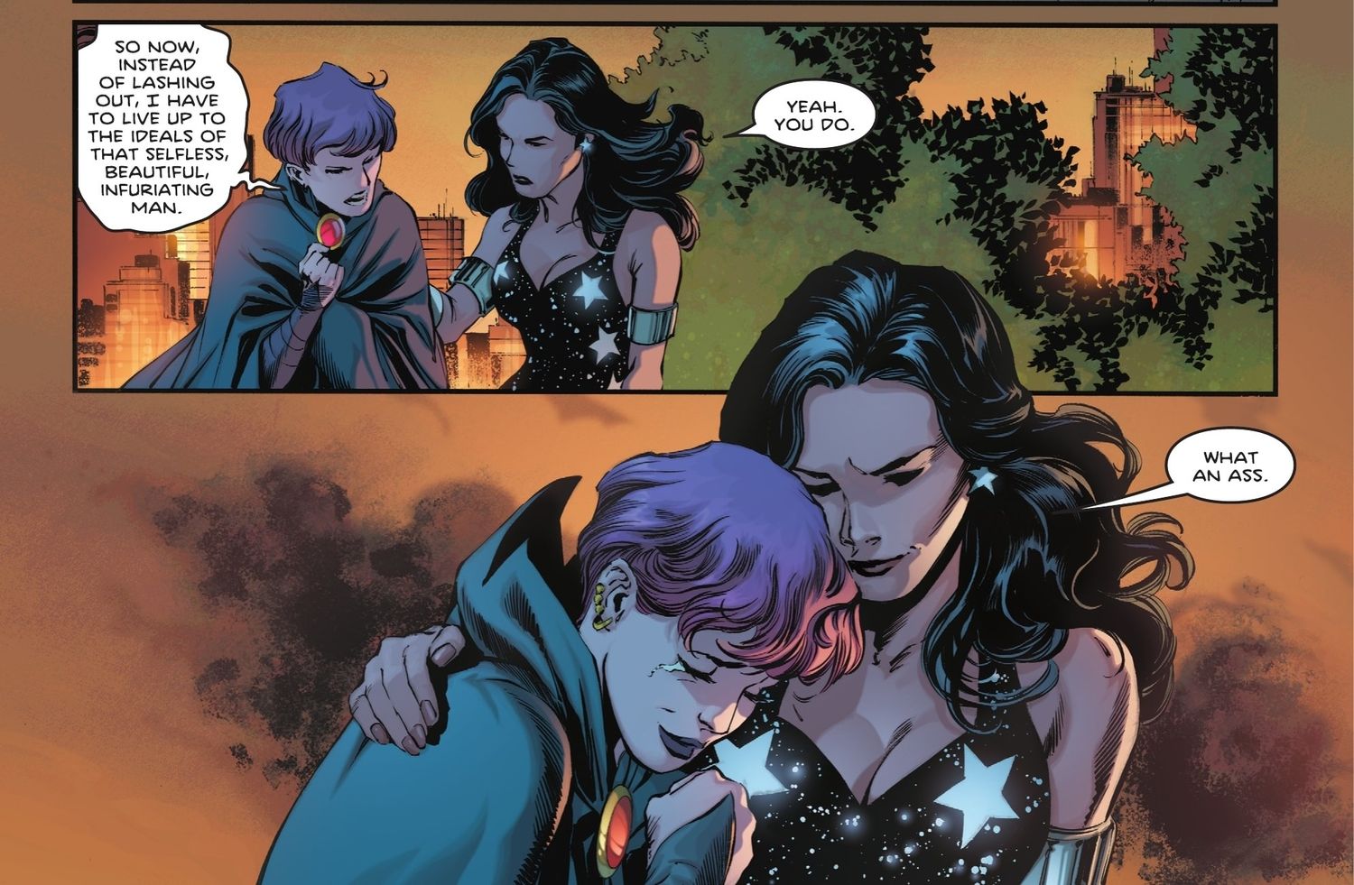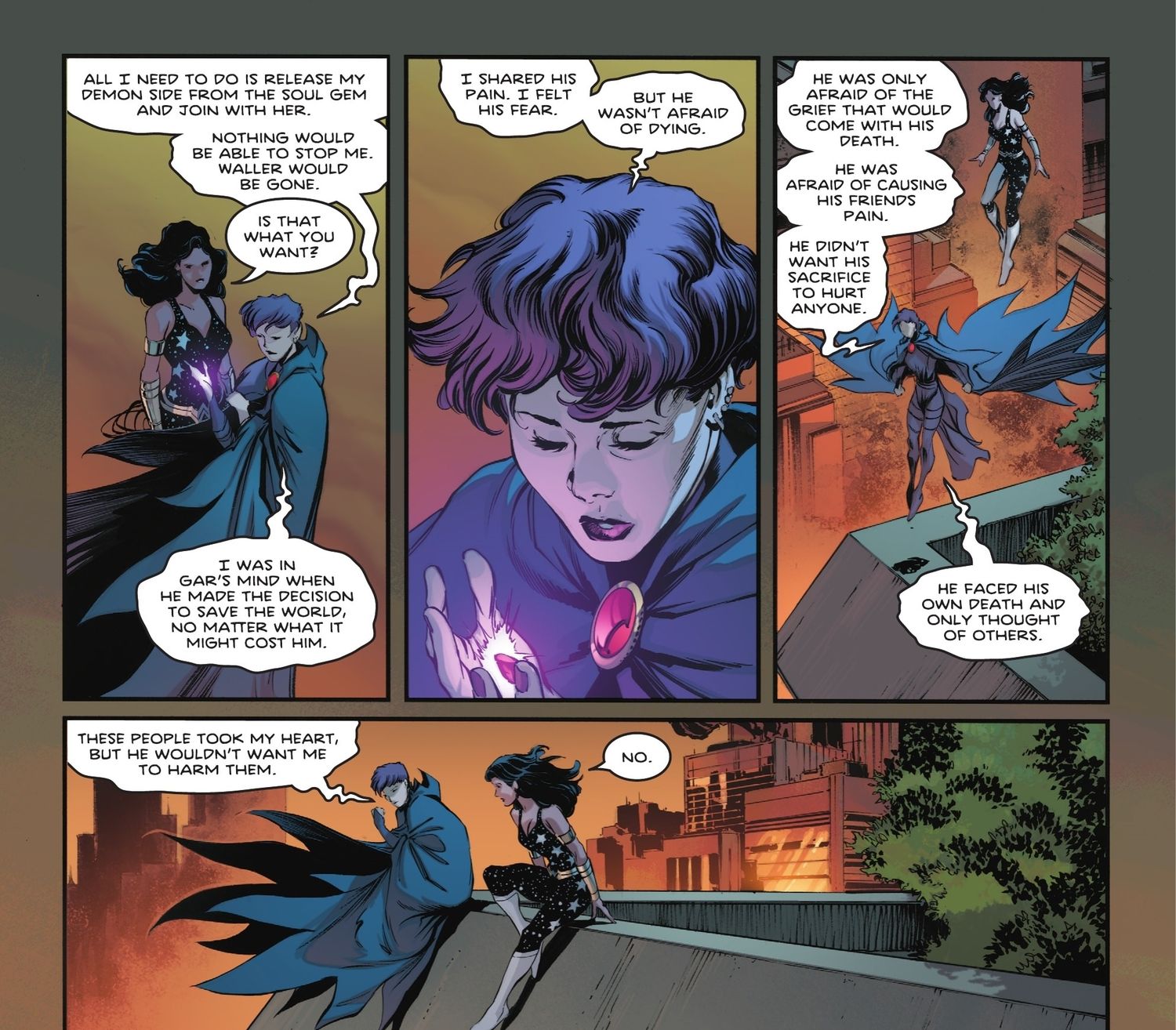 En una conmovedora conversación con la Chica Maravilla Donna Troy, Raven deja al descubierto su oscuro deseo y la capacidad de buscar venganza por la muerte de Chico Bestia. A pesar de la abrumadora necesidad de acabar con Waller y los responsables de llevársela “corazón“De lejos, Raven reconoce una verdad crucial: Garfield no querría que ella sucumbiera al camino de convertirse en una asesina. Es su amor inquebrantable por Chico Bestia lo que constituye la única barrera que impide que Raven busque venganza. y abrazar un camino que comprometería su integridad moral y su condición de héroe.