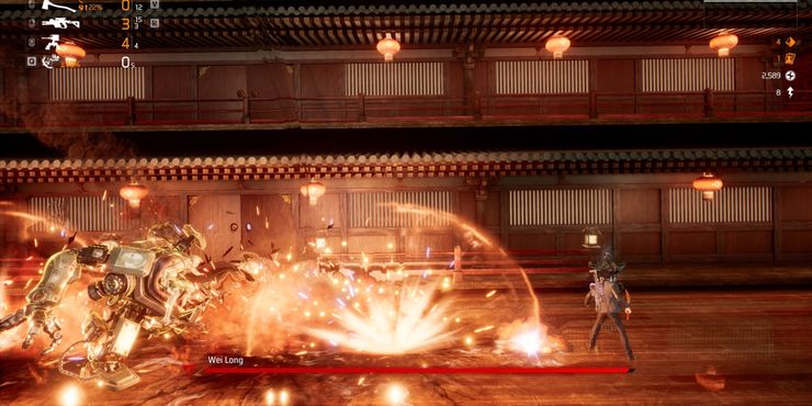 - Golpe de salto – el robot saltará y se estrellará contra el suelo. Cuanto menor sea el HP de Wei Long, más aplastará en sucesión. Una vez que el Mech toque el suelo, se disparará una onda de choque, así que mantén la distancia y retrocede para evitar que te golpeen.