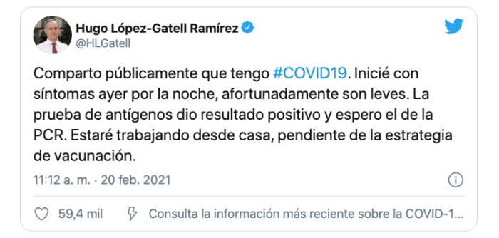 El sábado 20 de febrero, Hugo López-Gatell informó que padecía Covid-19; el lunes 1 de marzo, Alomía apuntó que este había sido dado de alta y que ya se encontraba en su casa, luego de una serie de declaraciones encontradas por parte de funcionarios federales.