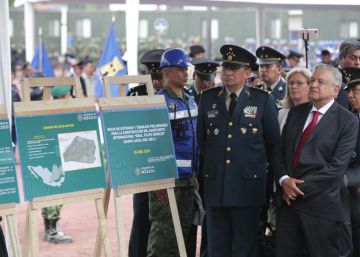 Soldados con cascos y maquinaria de construcción color oliva rodearon al presidente mexicano, Andrés Manuel López Obrador, en la presentación del nuevo proyecto del aeropuerto de Ciudad de México. Este lunes, el mandatario ha mostrado los planos del aeródromo que se construirá en la base aérea de Santa Lucía (a 50 kilómetros de Ciudad de México), elaborados por ingenieros y arquitectos del Ejército, después de que en diciembre su gobierno cancelara el aeropuerto de Texcoco, a 30 kilómetros de la capital y cuya obra está avanzada en un 30%.